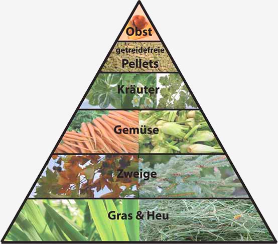 NahrungspyramideDiese Pyramide zeigt, in welchem Verhältnis die einzelnen Nahrungsmittel gefüttert werden sollen. Gras und Heu sind Grundnahrungsmittel, ebenso sollten häufig Zweige angeboten werden. Getreidefreie Pellets und Obst hingegen sind Leckereien, die nur selten gegeben werden sollten. |
